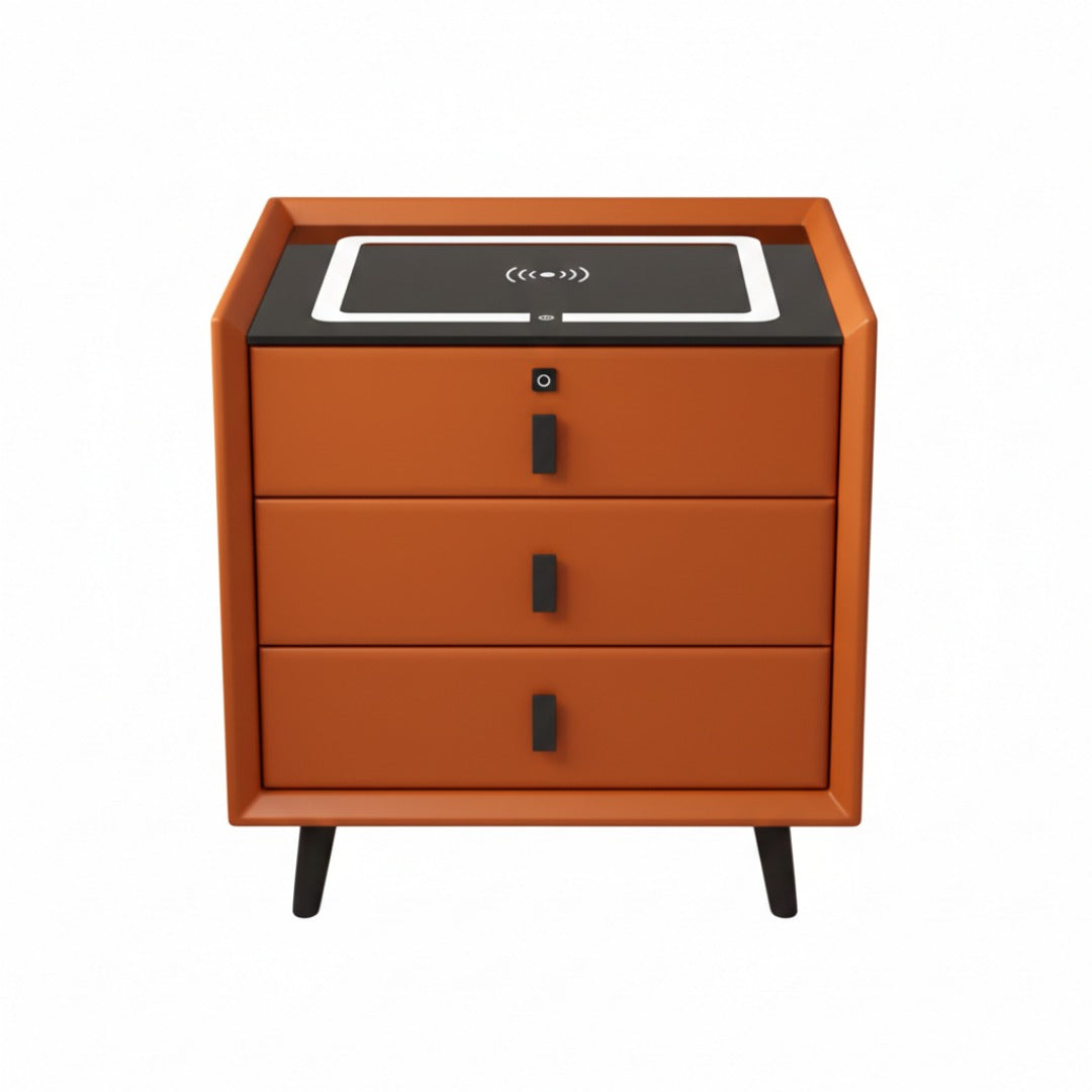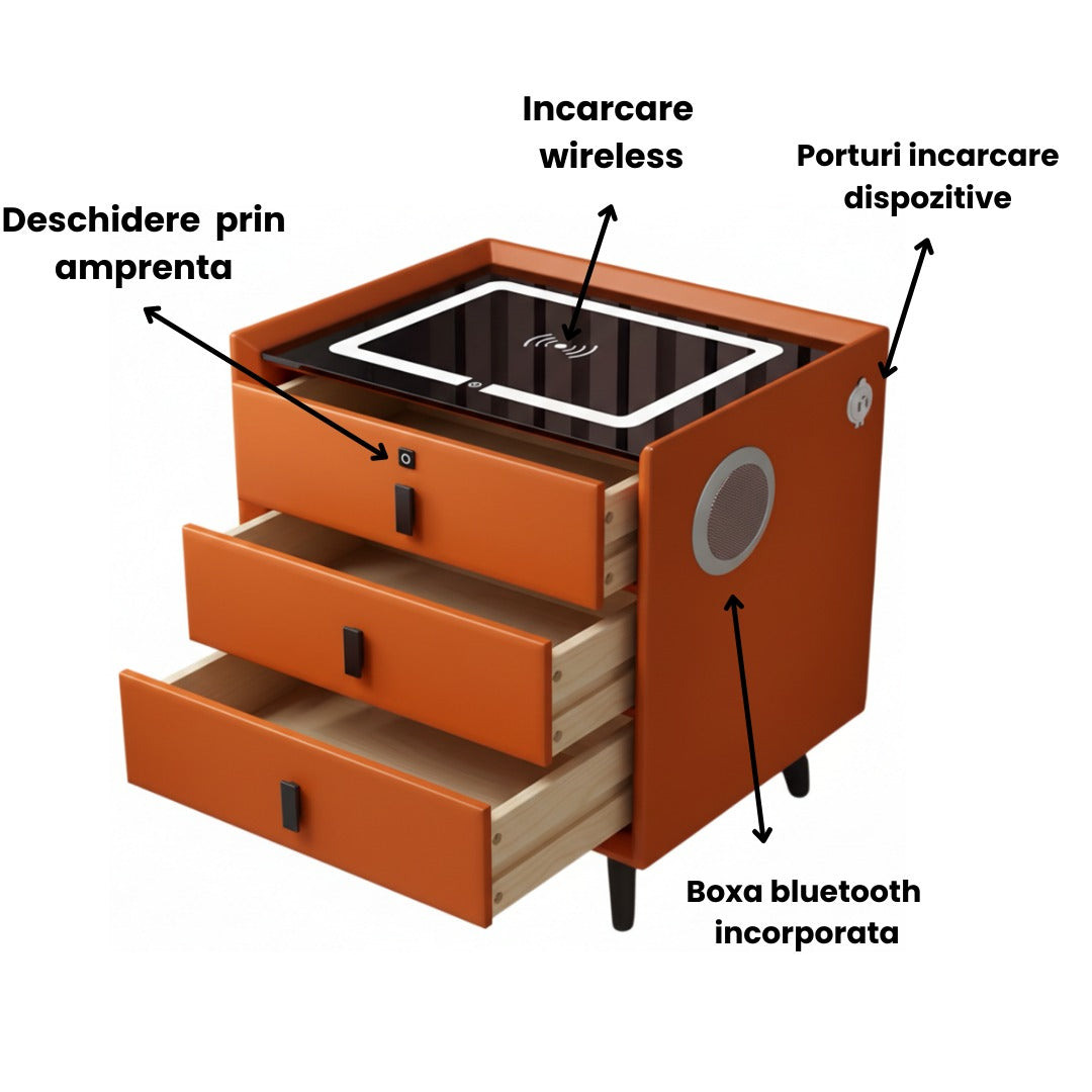 Noptieră Inteligentă 3 în 1: Boxă Bluetooth Incorporată, Încărcare Wireless 15W, Lumină LED, 3 Sertare, Portocaliu