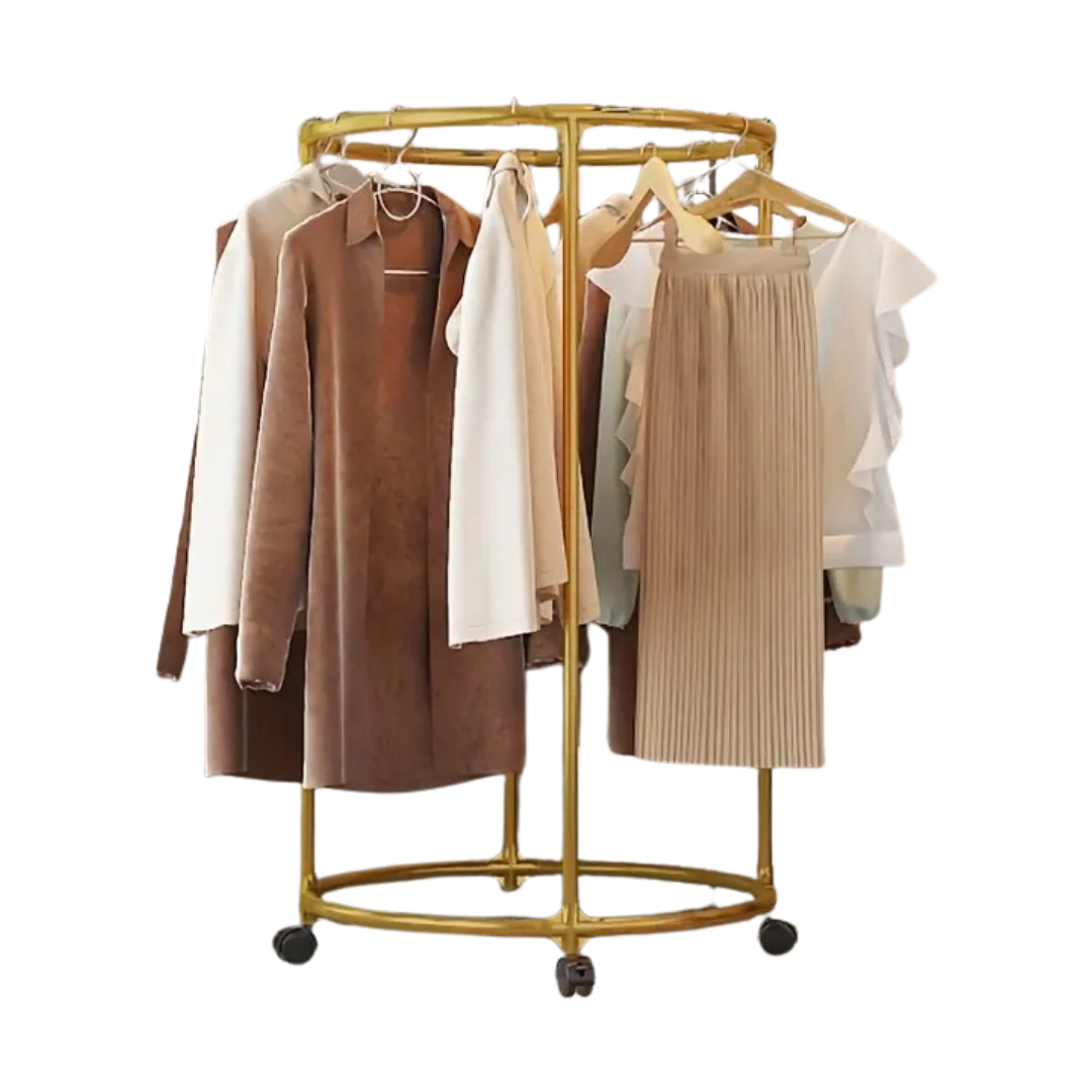 Acest suport rotund din oțel inoxidabil cu finisaj auriu aduce un plus de rafinament și eleganță oricărui spațiu. Este ideal pentru haine grele și se remarcă printr-un design minimalist, stabilitate excelentă și mobilitate ușoară. Perfect pentru magazine, showroom-uri, garderobe sau dressinguri moderne.
